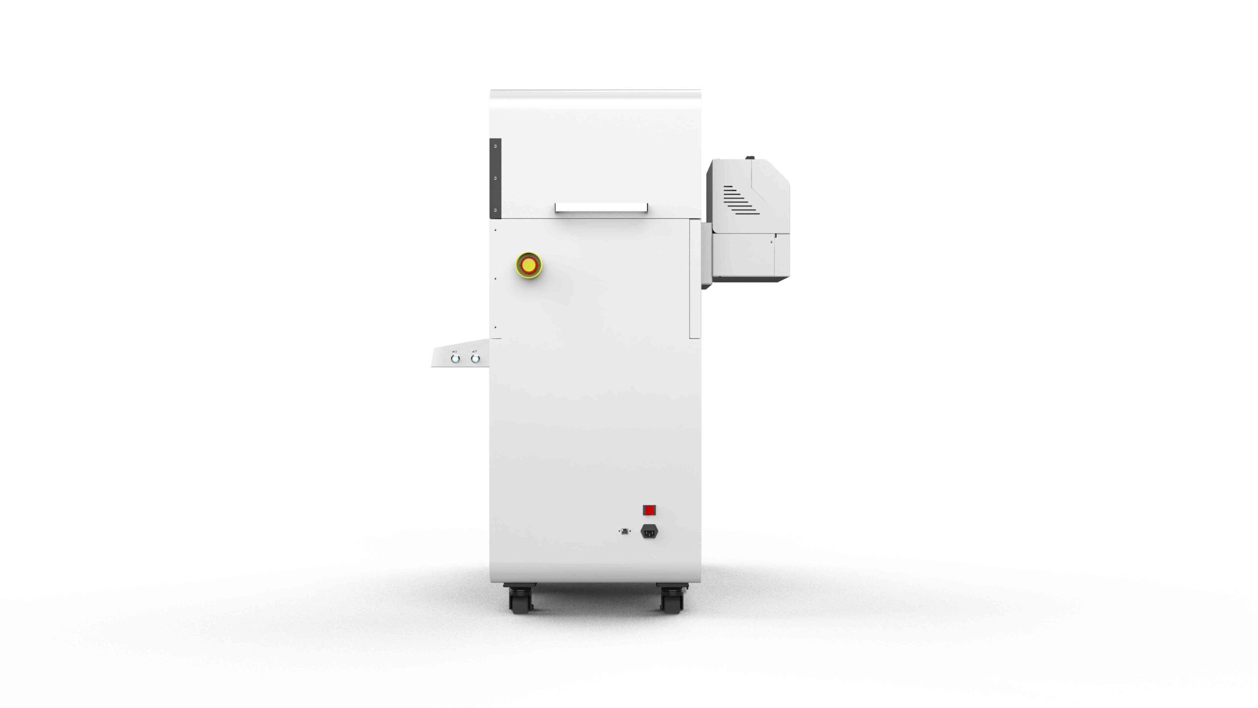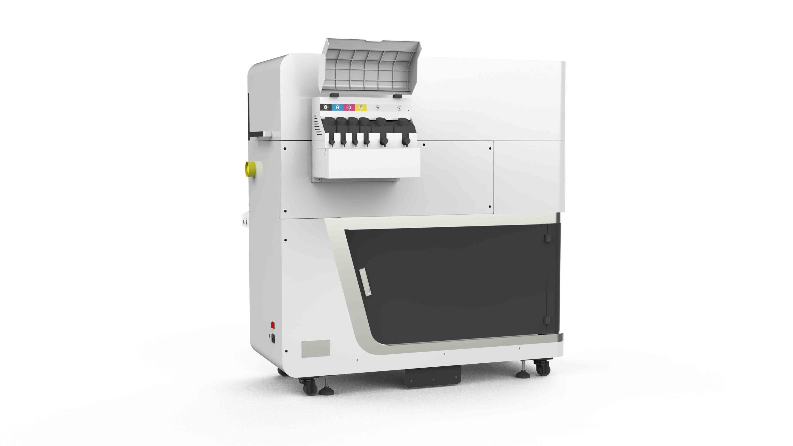 Trešās paaudzes digitālais tintes printeris izmanto spirālveida drukas tehnoloģiju un vienlaikus pārklāj ar 360° baltu laku.