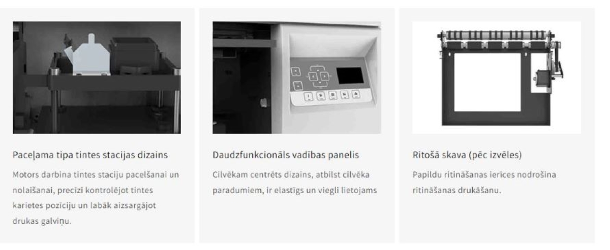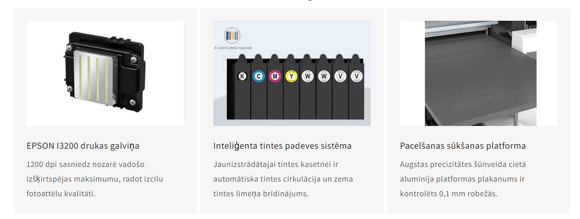 Pieejamās krāsas: CMYK+W+V, kas ļauj drukāt krāsaini, balta un lakota.