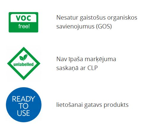 Ekoloģisks produkts no videi draudzīgiem savienojumiem. Bez smakas. Nesatur gaistošus organiskos savienojumus.