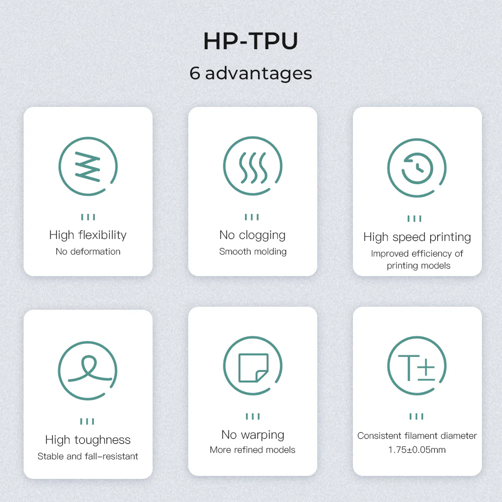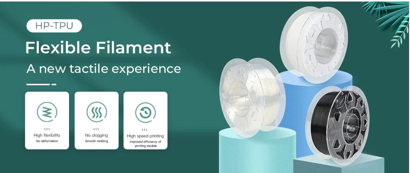 Creality HP-TPU ir elastīgs inženiertehniskais materiāls, ir optimizēts darbam ar jaudīgiem ekstrūderiem tad spēj nodrošināt drukas ātrumu 200 mm/s.