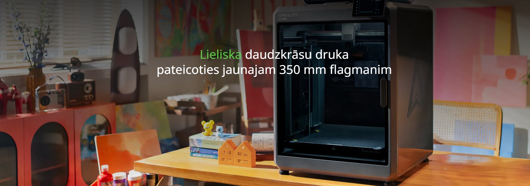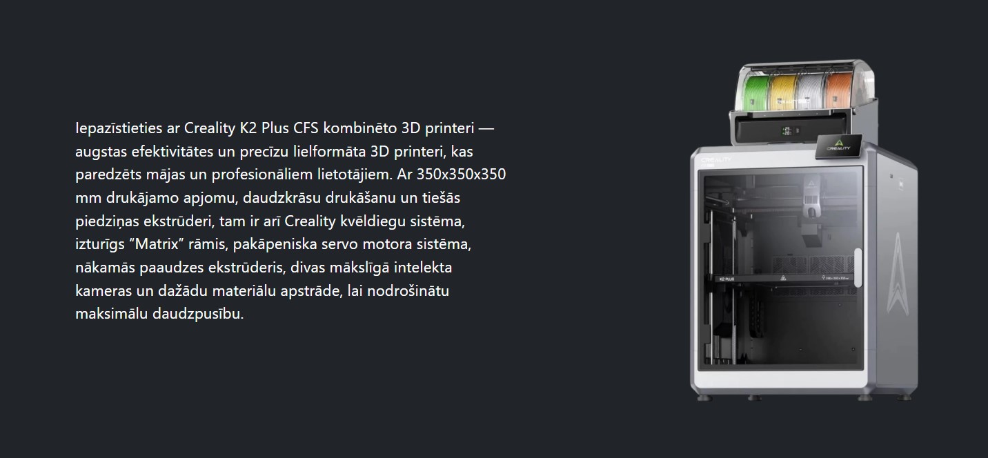 Creality K2 Plus Combo ir Creality vadošais 3D printeris, kas apvieno lielu drukas apjomu, profesionālu ātrumu un pilnībā automatizētu daudzkrāsu drukāšanu.