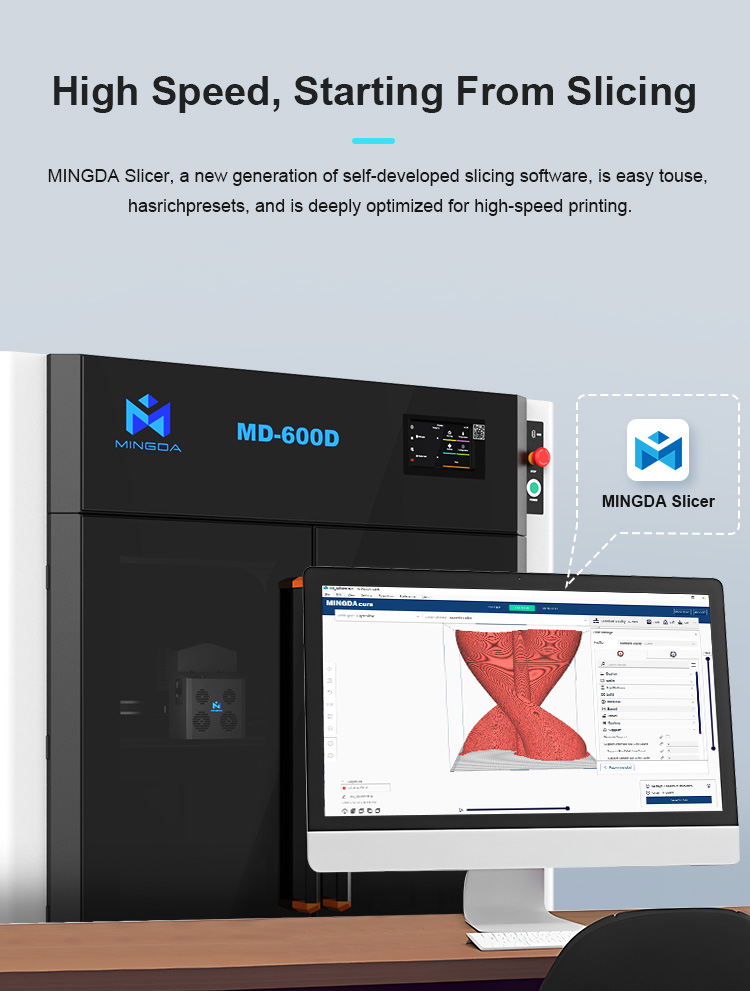 MINGDA MD-600D FDM ir profesionāla līmeņa 3D printeris darbam ar daudzkrāsainiem augstas kušanas temperatūras kvēldiegiem.